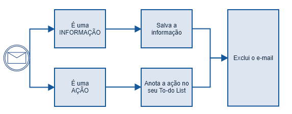 Você pode optar por fazer da sua Caixa de Entrada um local em que permaneçam apenas os itens pendentes de alguma ação. Já é um ganho, pois você já consegue identificar o que realmente precisa de uma ação sua, porém eu desaconselho essa atitude. Afinal você não deixa a correspondência da sua conta de luz parada na sua caixa de Correio até pagá-la, certo?